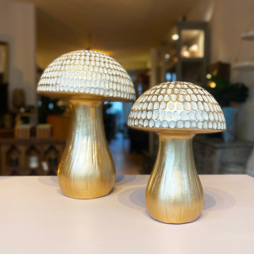 Deze elegante decoratie paddestoelen in goud voegen een stijlvolle touch toe aan je interieur. Verkrijgbaar in twee maten, perfect om samen of apart te plaatsen.