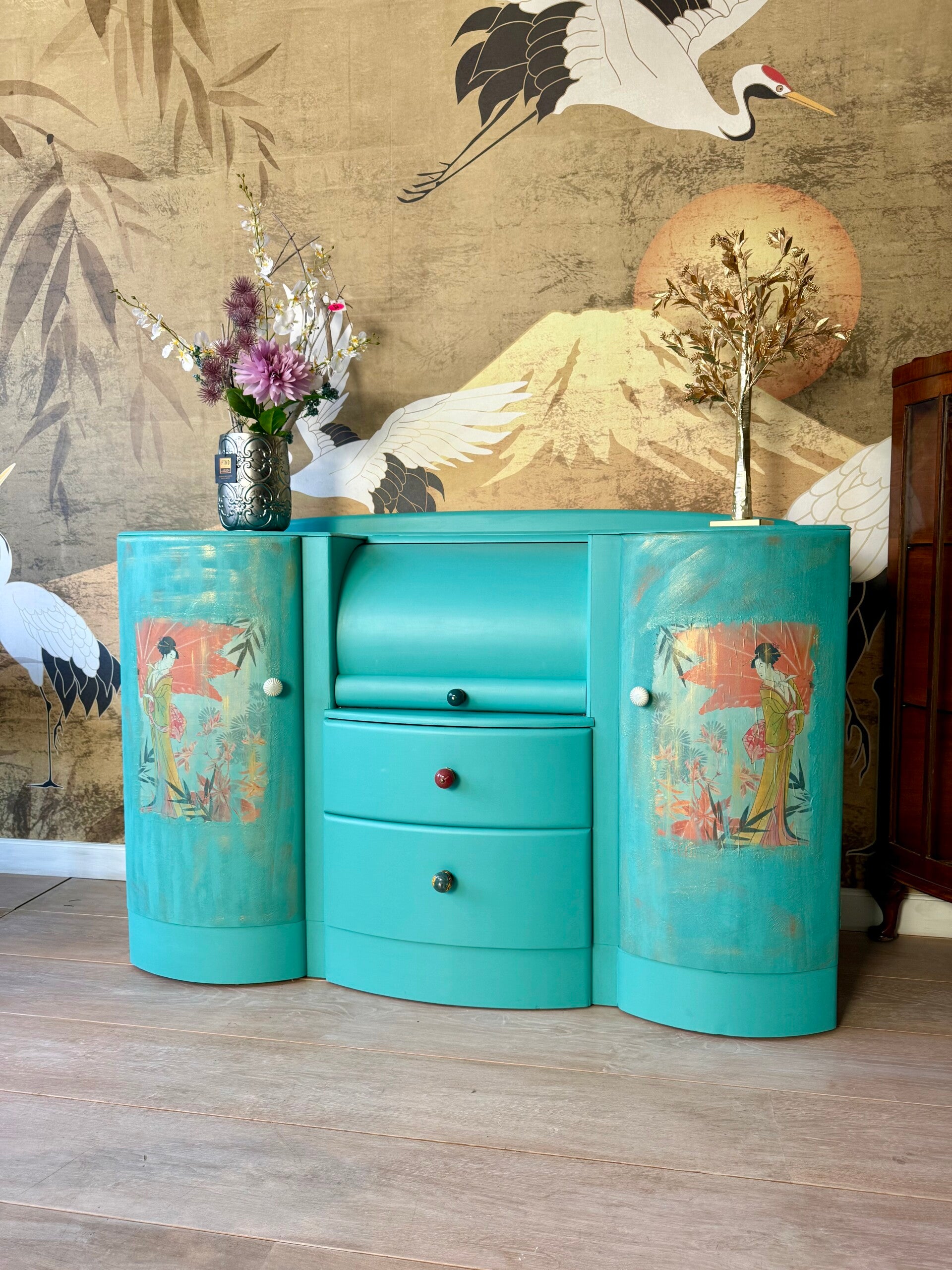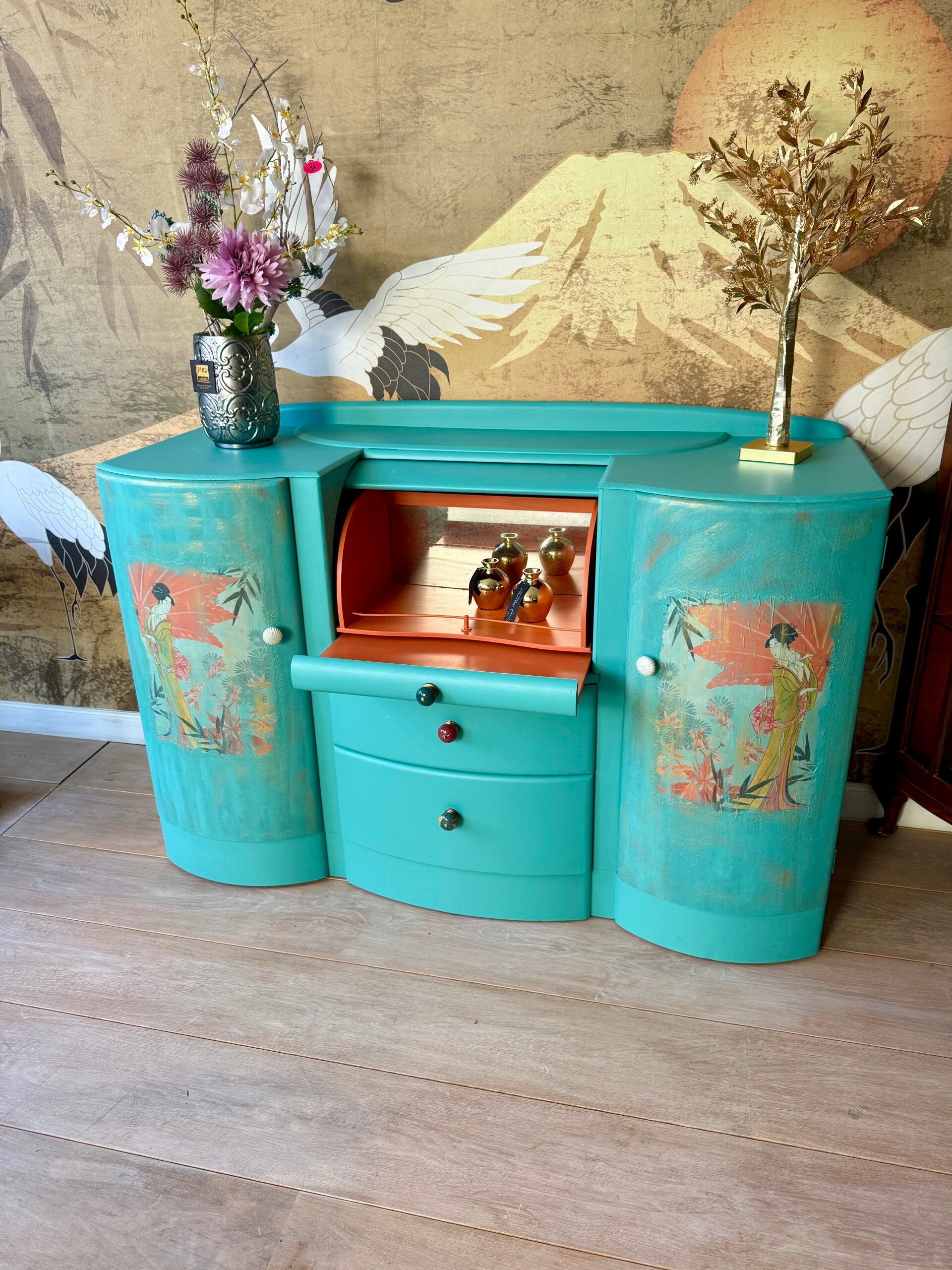 Zoek je een bijzondere vintage kast, een Japanse stijl kast of een handgeschilderd meubelstuk met karakter? Dan is dit een perfecte match.