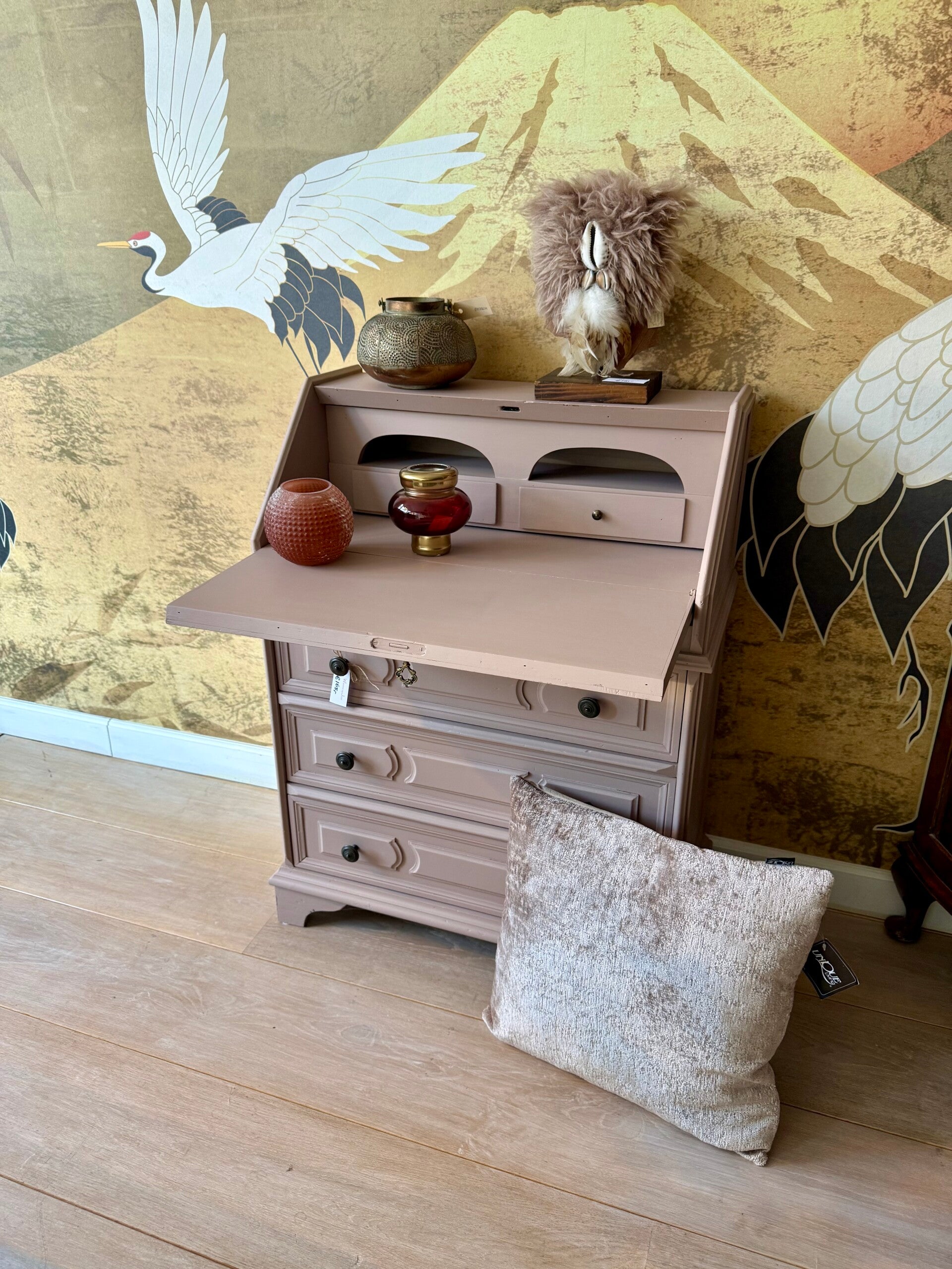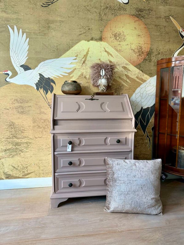 Deze kleine vintage secretaire is een charmant en functioneel meubelstuk. De secretaire is met zorg handgeschilderd in de kleur Damask van Fusion Mineral Paint, een zachte, warme taupe/rozetint die moeiteloos past in zowel een klassiek als modern interieur.