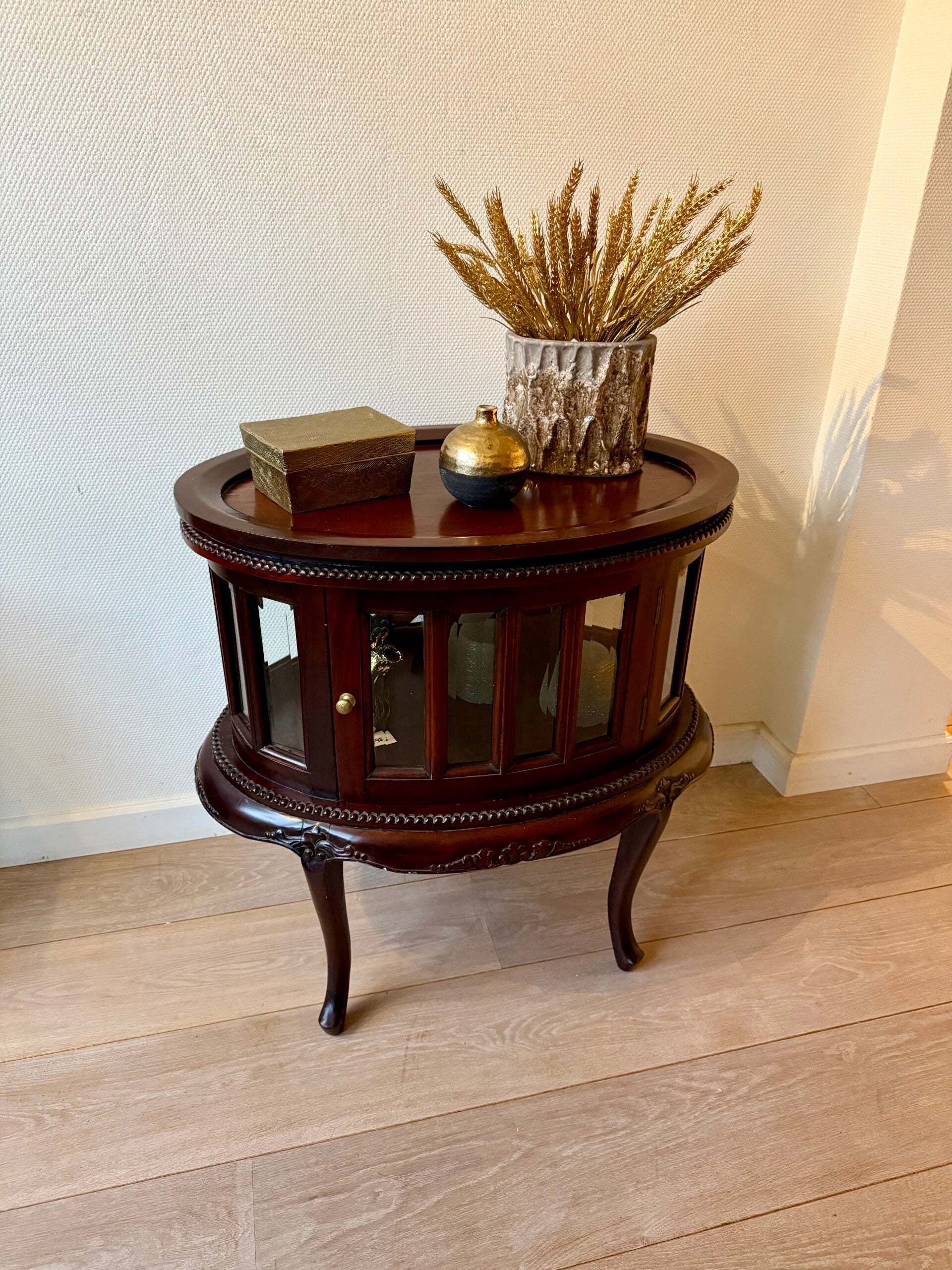 Dit elegante vintage theekastje is een ovaal en verfijnd meubelstuk met klassieke uitstraling en praktische details. Het kastje is uitgevoerd in origineel hout en staat op sierlijke poten, wat zorgt voor een tijdloos en chique karakter.