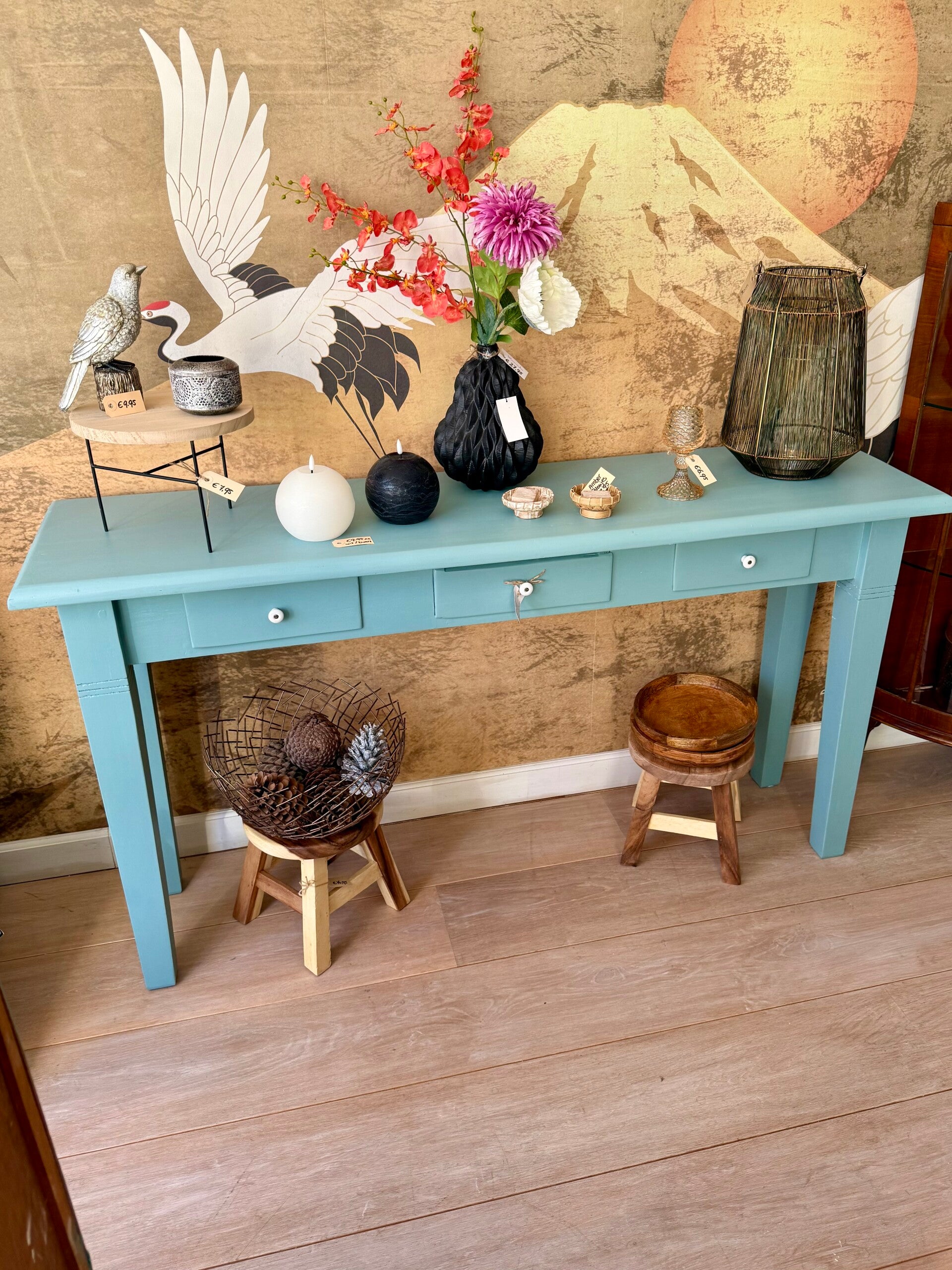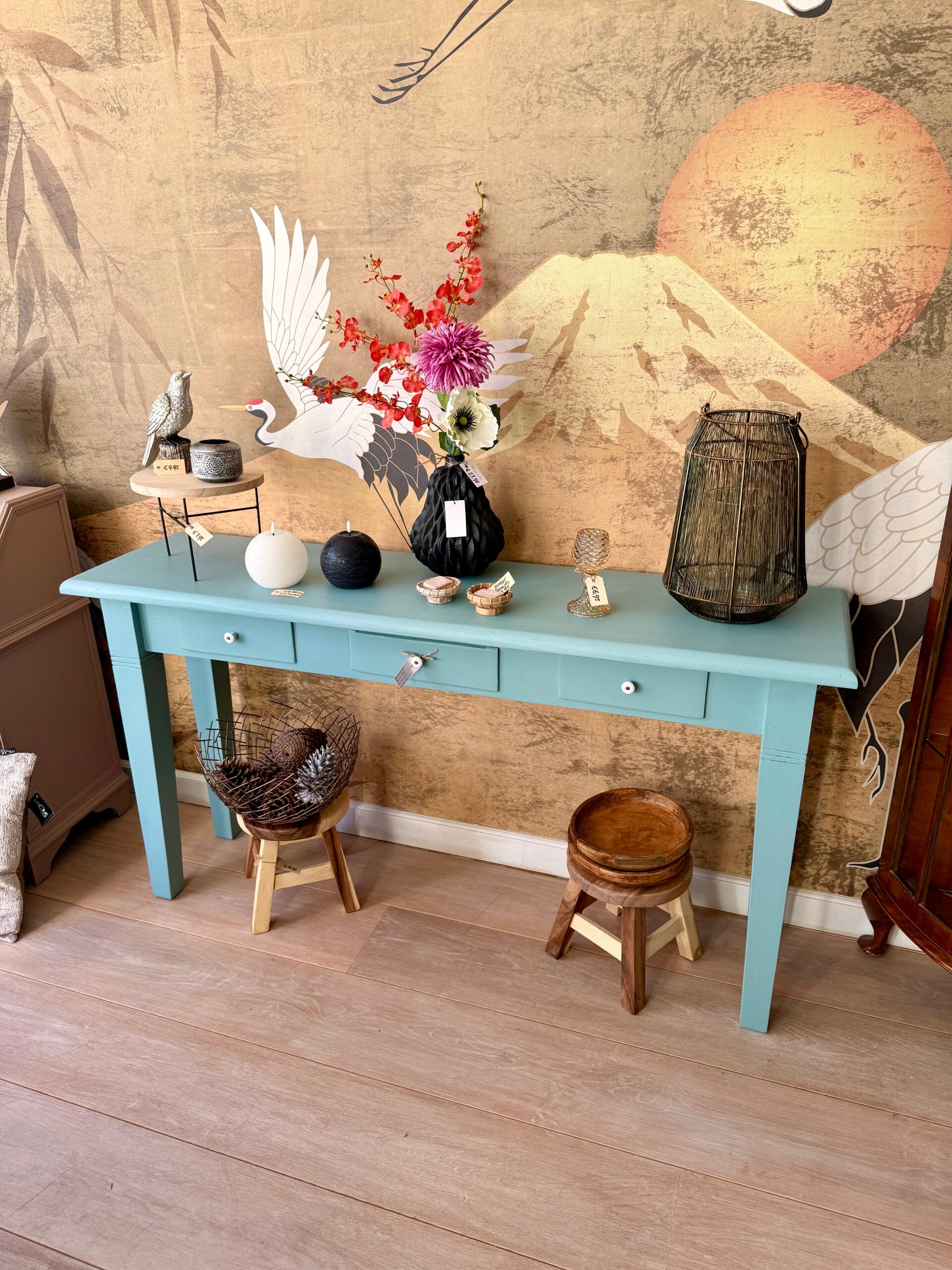 Deze stijlvolle sidetable is een perfect mix van elegantie en functionaliteit. Het meubel is met zorg handgeschilderd in de kleur Heirloom van Fusion Mineral Paint, een zachte blauwe tint die rust en karakter toevoegt aan elk interieur. De kleur past prachtig in zowel een modern, landelijk als eclectisch woonstijl.