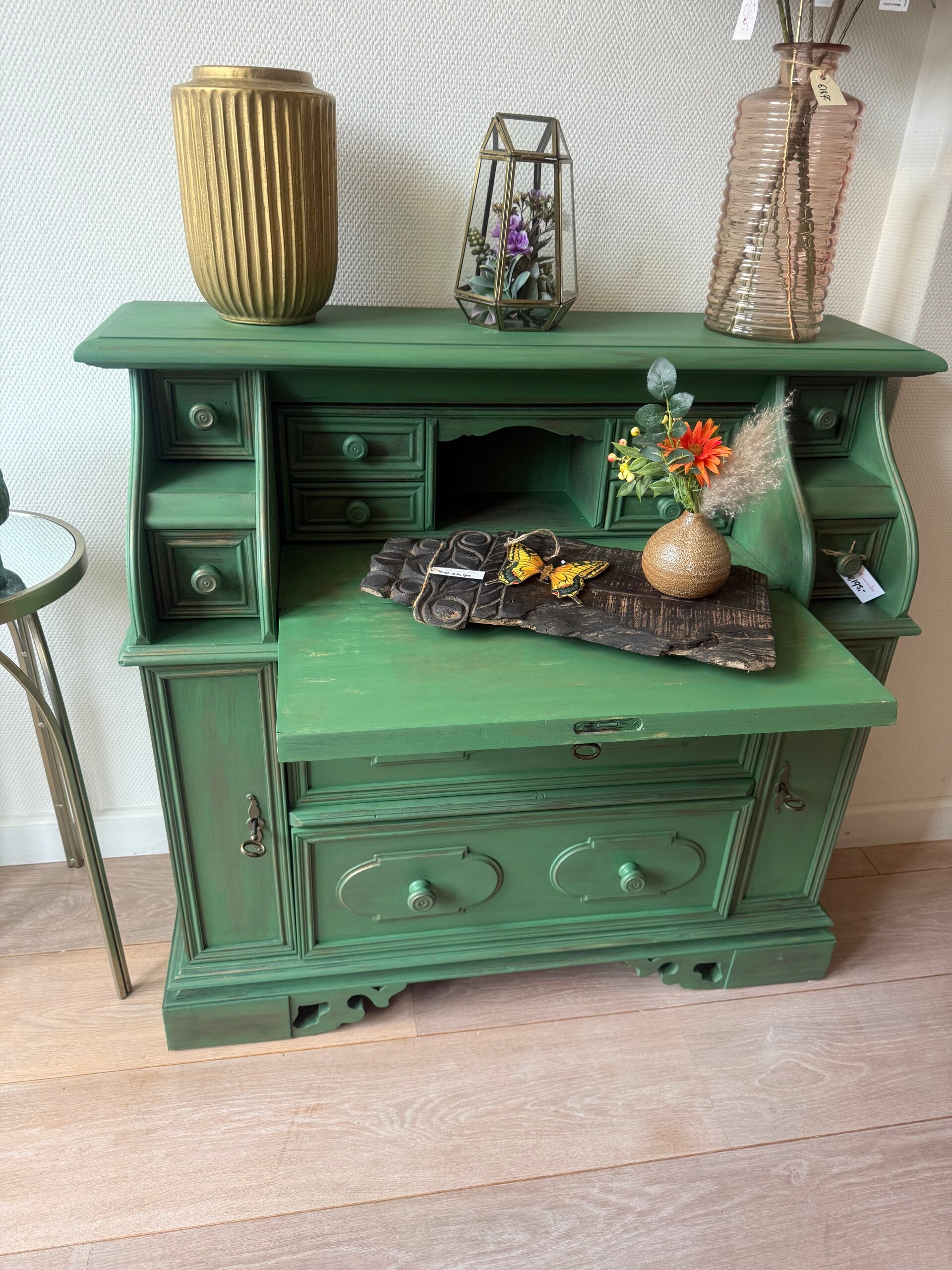 Unieke vintage secretaire in de kleur Park Bench, afgewerkt met subtiele bronze accenten voor extra diepte en karakter. Deze kast is met zorg gerestyled met Fusion Mineral Paint en heeft een warme, klassieke uitstraling met een stoere touch.