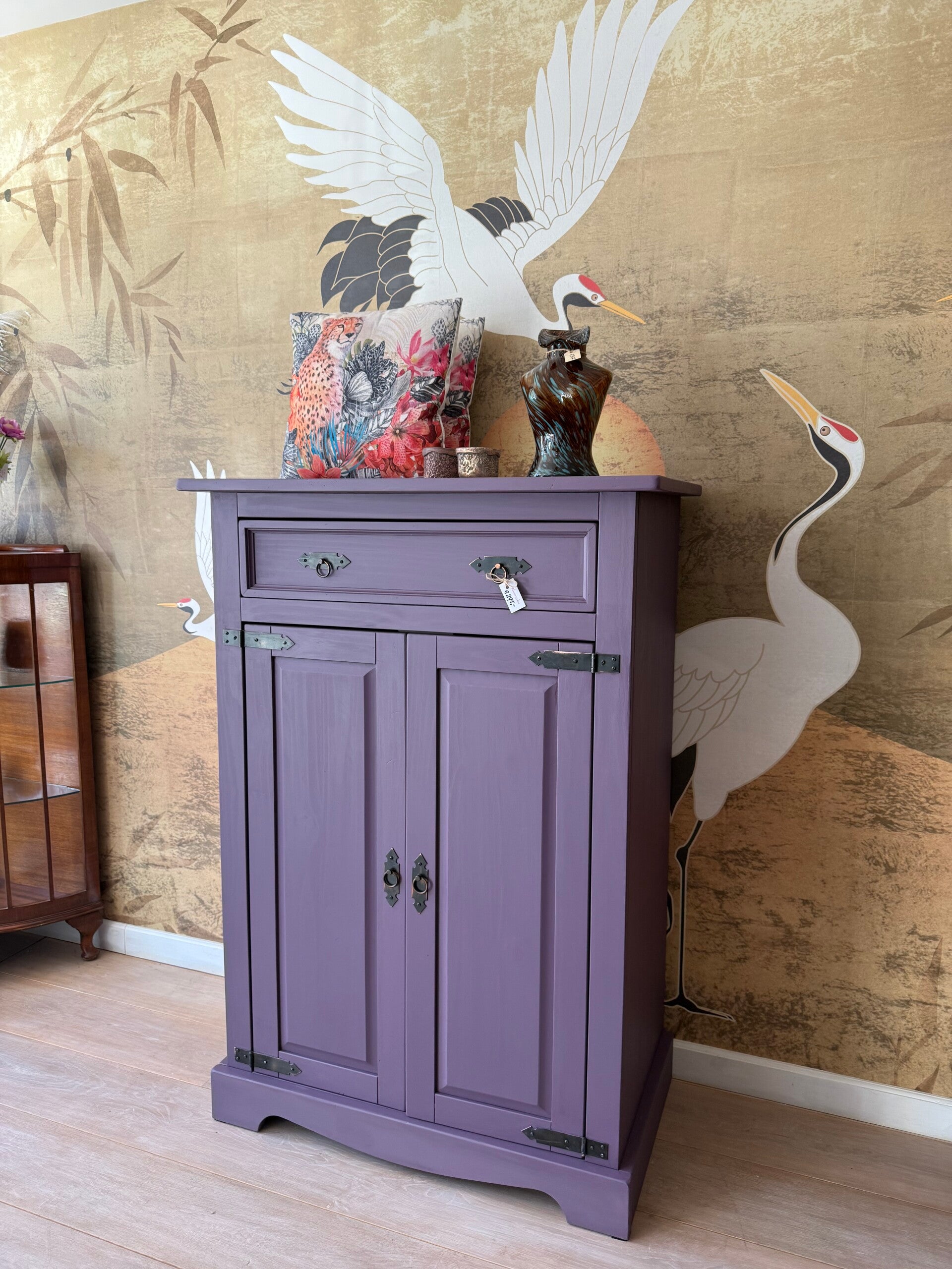 De kast is professioneel geschilderd met Fusion Mineral Paint in de kleur Velvet Plum, iets lichter gemengd voor een zachte, warme paarstint. De matte afwerking geeft het meubel een rustige, luxe uitstraling die perfect past in een landelijk, romantisch of modern interieur.