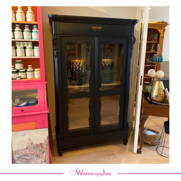 De Biedermeier vitrinekast hebben wij geschilderd in Coal Black en de binnenkant is Damask.