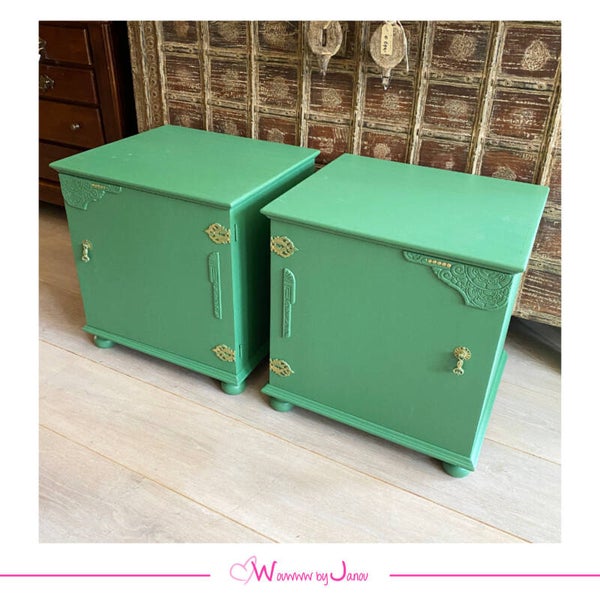 Set leuke nachtkastjes hebben wij geschilderd in de kleur Park Bench met een paar kleine details in Gold